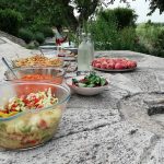 Si è svolto ieri sera in contrada Poggio Gallo, territorio di Chiaramonte Gulfi, nella splendida tenuta dei coniugi svizzeri Romano e Luana Piazzini, l’ultimo incontro del primo percorso ideato dall’associazione Salucibando: apericena servito a bordo piscina realizzato con un menù salutare secondo i principi dello stile di vita mediterraneo. La biologa nutrizionista Letizia Licitra ha ideato, in collaborazione con tutti gli ospiti, un menù salutare a base, principalmente, di legumi e ciò per sfatare anche un mito duro a morire: i legumi possono essere mangiati solo in zuppa o con la pasta. Il menù dell’apericena mediterrneo è stato un trionfo di originalità, in stile decisamente green e nel pieno rispetto dell’ambiente: “La dieta mediterranea è uno stile di vita, non ha nulla a che vedere con la restrizione calorica. E forse può sembrare strano, ma alla base della piramide, prima del cibo, prima di tutto, vi è la convivialità, il movimento, un adeguato riposo, l’acqua e la stagionalità. Poi, arriva tutto il resto”. I legumi d’estate? Si, certamente, è possibile mangiarli sotto diverse forme e non soltanto nelle classiche zuppe: “In realtà in cucina abbiamo ben poca fantasia. Questo menù è stato pensato per dare alcune idee semplici, salutari e molto divertenti, adatte anche ai più piccoli”, spiega Letizia Licitra. E allora, su le maniche e mani in pasta: tutti gli ospiti si sono suddivisi in gruppi di lavoro, coadiuvati dai padroni di casa. Il menù per l’apericena mediterraneo ha proposto polpette di noci, piselli e ricotta, fave fritte e falafel (piatti tipico della cucina araba, simili a delle polpette, realizzate con ceci), insalata dell’orto di Romano Piazzini e mini burger di lenticchie rosse con pinzimonio di verdure. Salsa allo yogurt per accompagnare, cous cous di verdure, humus di ceci accompagnato da pane arabo con frumento e al grano saraceno cotto alla brace. Il grano saraceno, tra l’altro, non essendo un vero cereale, è privo di glutine. Infine, tartufi di avocado e cacao e per chi volesse, gelsi da raccogliere direttamente dall’albero. Più chilometro zero di così? “Il menù green serve a farci comprendere come la sostenibilità ambientale sia alla portata di tutti e, soprattutto, come questa riesce a farci vivere meglio e aiuti la nostra salute”. Una serata semplice, piacevole, a cui hanno partecipato anche i nuovi chiaramontani, ovvero coloro che hanno scelto la città di Chiaramonte come loro patria e abitano tutto l’anno nella splendida campagna iblea. Non solo, dunque, consigli per la nostra dieta: i percorsi ideati da Salucibando hanno avuto il grande merito di far conoscere una bella parte della città di Chiaramonte a questi nuovi cittadini che provengono dal nord Italia e da altre zone dell’Europa. E la serata, infatti, è stata l’occasione per chiacchierare in allegria, per conoscere nuove idee e nuovi modi di approcciarsi alla vita, per comprendere meglio le ragioni che hanno spinto queste persone meravigliose a scegliere Chiaramonte come città ideale in cui vivere.