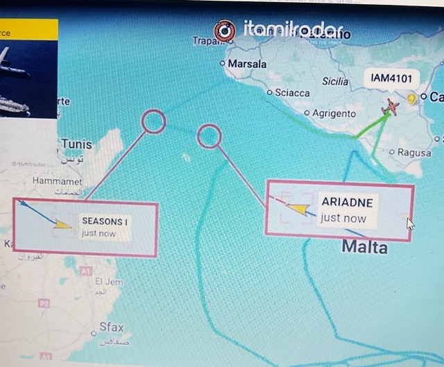 Nel corso della missione, l’aereo spia P-72A ha intercettato e monitorato due imbarcazioni considerate sospette. La prima era la nave cargo Ariadne (IMO 9397547), battente bandiera russa. Secondo i dati di tracciamento disponibili, citati da “Itamilradar”, l’aereo italiano ha orbitato attorno alla nave per un periodo prolungato.