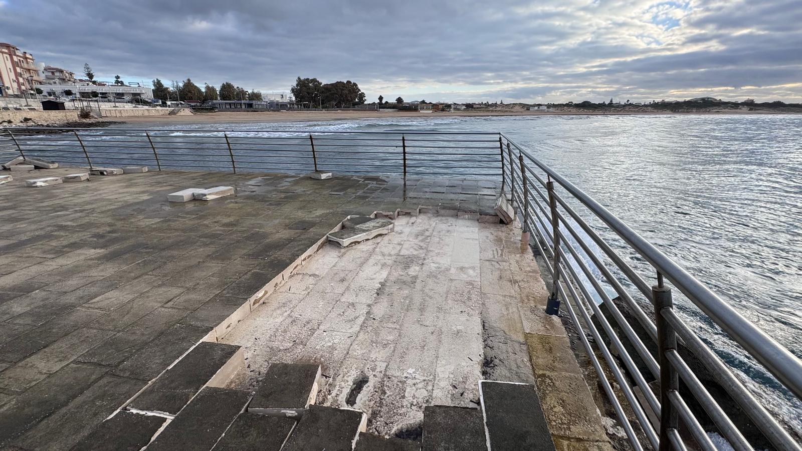 Oggi la struttura appare profondamente segnata dalle onde: la forza del mare ha divelto la pavimentazione in pietra di Modica, mentre le pesanti panchine in pietra, dal peso di svariate centinaia di chilogrammi, sono state spostate e scagliate contro la ringhiera. Le saldature di quest’ultima risultano compromesse in più punti, con evidenti ripercussioni anche sul fronte della sicurezza.