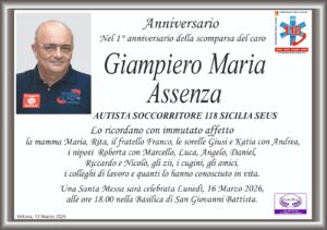 Oggi, alle 18, nella basilica di San Giovanni Battista, si terrà una messa in suffragio nel primo anniversario della scomparsa di Giampiero Maria Assenza (nella foto), autista soccorritore 118 Sicilia Seus. I parenti invitano gli amici a partecipare.