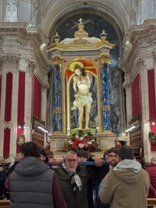 Le processioni hanno attraversato il quartiere barocco come un’unica grande narrazione. Le confraternite, con i loro abiti, i loro simboli e la loro compostezza, hanno portato in corteo i simulacri accompagnati dalle note della banda “San Giorgio – Città di Ragusa”, un sottofondo mesto e solenne che ha amplificato la suggestione del momento. Ogni uscita dalle chiese, ogni svolta tra le stradine, ogni arrivo in piazza Duomo sembrava sospeso nel tempo, come se la città intera respirasse all’unisono.
