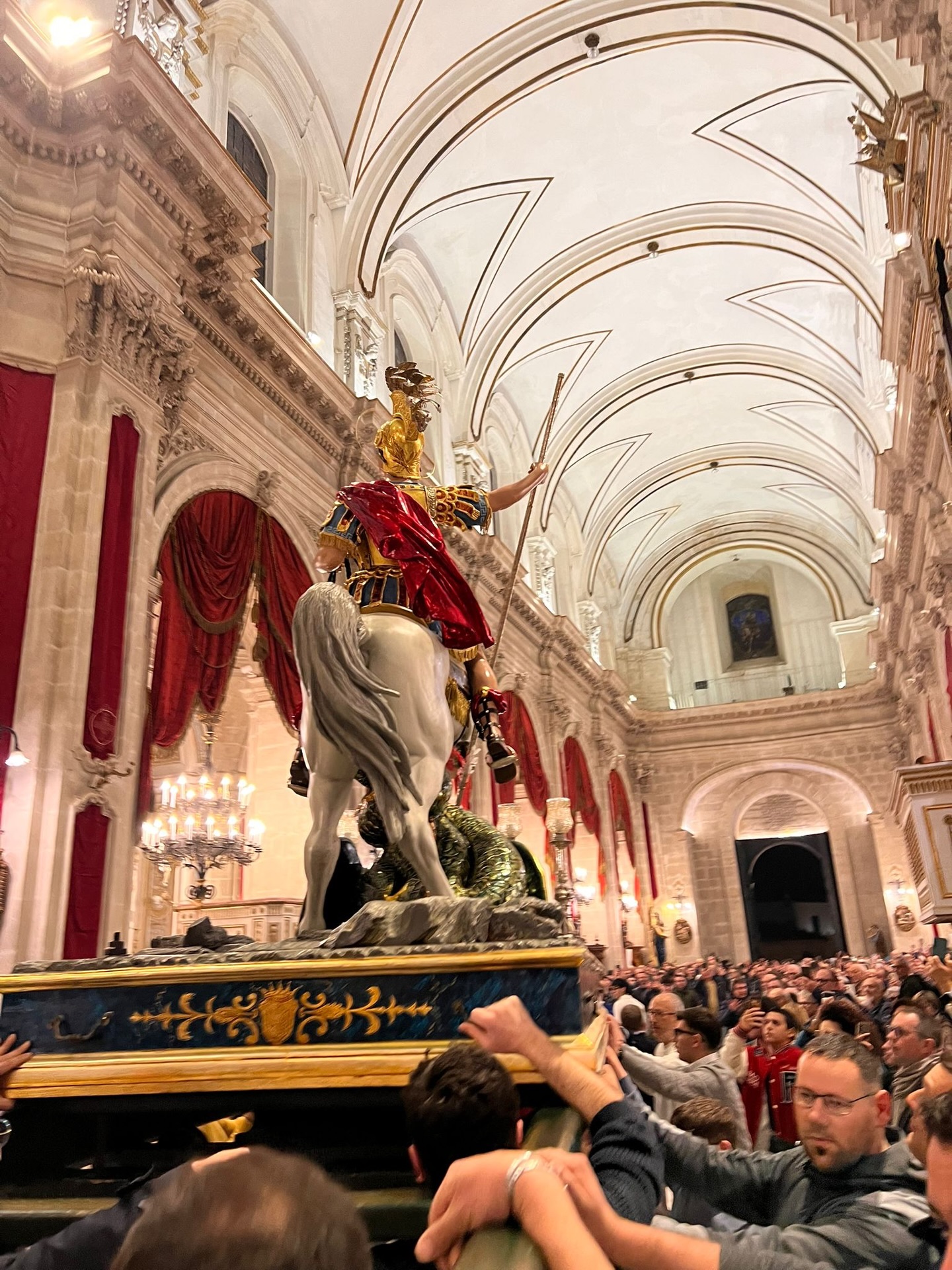 La Chiesa Madre era gremita. Dopo la messa, i devoti hanno circondato la statua in un abbraccio tramandato di generazione in generazione. Quando l’organo maggiore ha intonato la marcia di San Giorgio, il simulacro, sollevato sulle spalle dei portatori, ha iniziato la tradizionale “ballariata”: non un semplice movimento, ma una danza rituale — il cavallo che avanza, si arresta e riprende il passo; il santo che pare guidare il popolo; la navata che si fa strada, piazza, memoria condivisa.